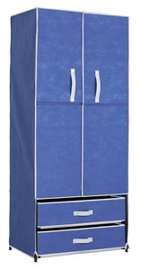 in TNT. Struttura tubolare in metallo. Completo di mensola e due cassetti. Dimensioni cm 76x46x172h Colore blu