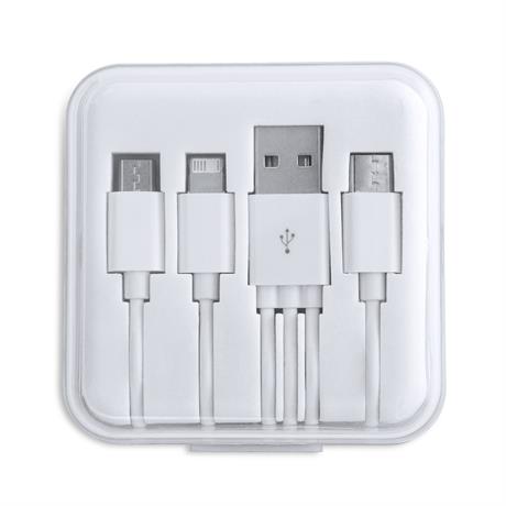 Cavo di ricarica 3 in 1. Presentato in una pratica custodia con supporto per smartphone integrato. Connessione micro USB, Tipo C e Lightning.