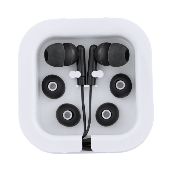 Cuffie in custodia PS. Collegamento jack da 3,5 mm. Cavo con pulsante di sicurezza incluso. Include 3 paia di custodie di diverse dimensioni.
