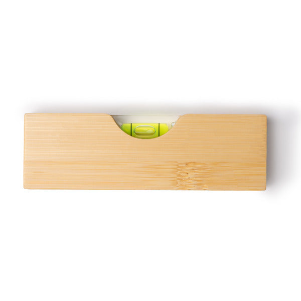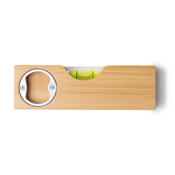 Livella a bolla in bambù con apribottiglie in metallo integrato.