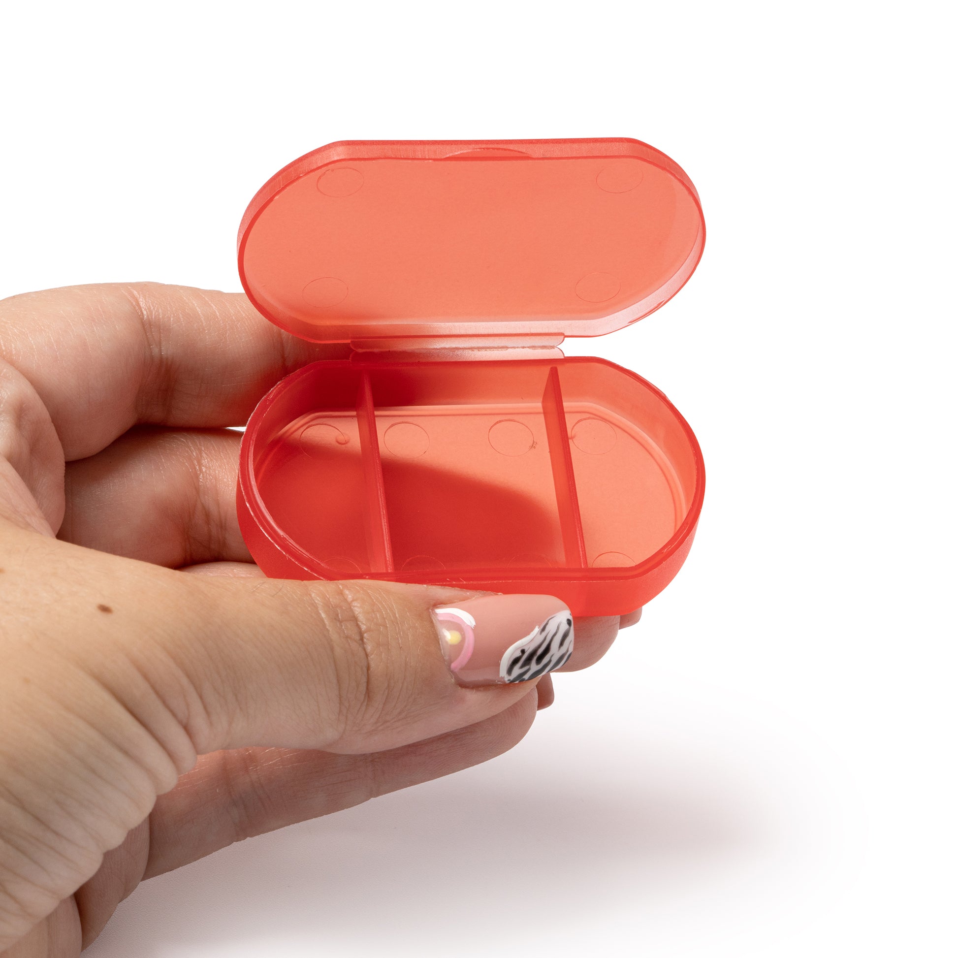 Portapillole leggero, a tre scomparti. Design colorato con finitura tras