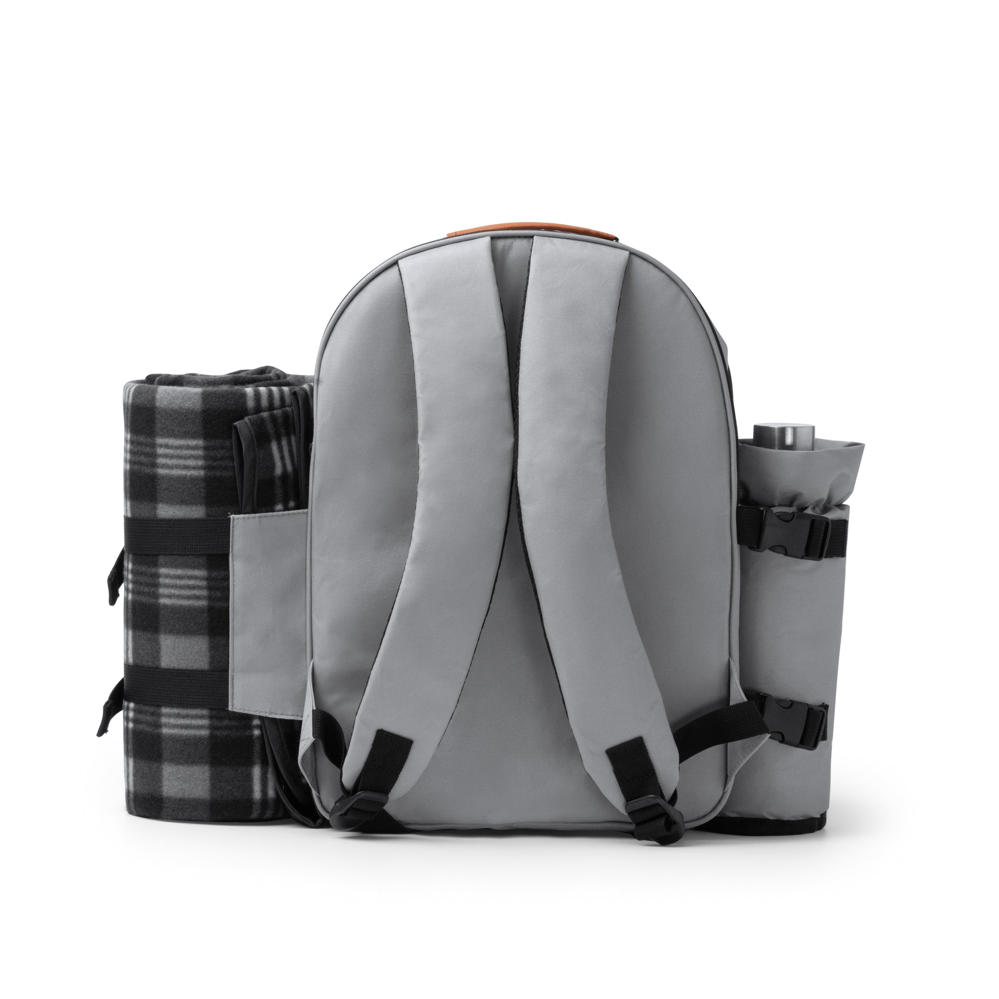 Zaino da picnic in poliestere RPET. Scomparto principale comprendente: 2 tazze, 2 piatti, 2 set di posate. Uno scomparto laterale per la coperta da picnic (inclusa) e uno scomparto laterale per le bottiglie.