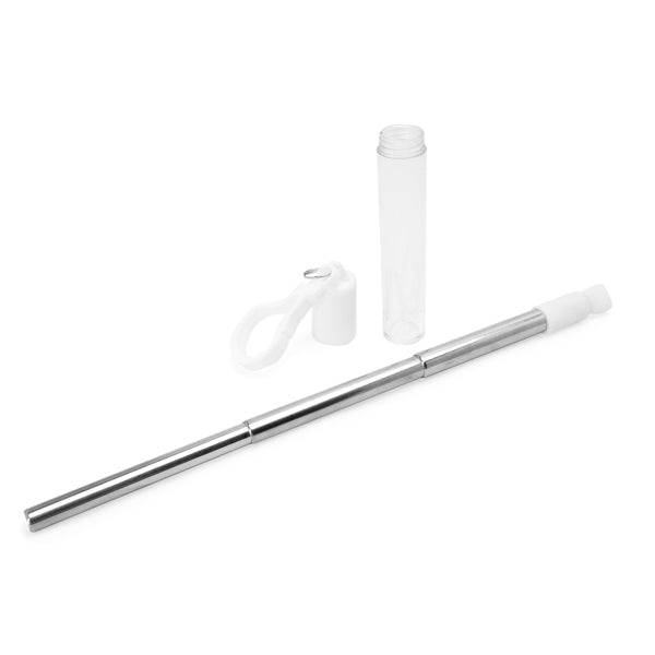 Cannuccia allungabile riutilizzabile in acciaio inox 304 con beccuccio in silicone. Include una spazzola per la pulizia e una custodia per il trasporto con moschettone.